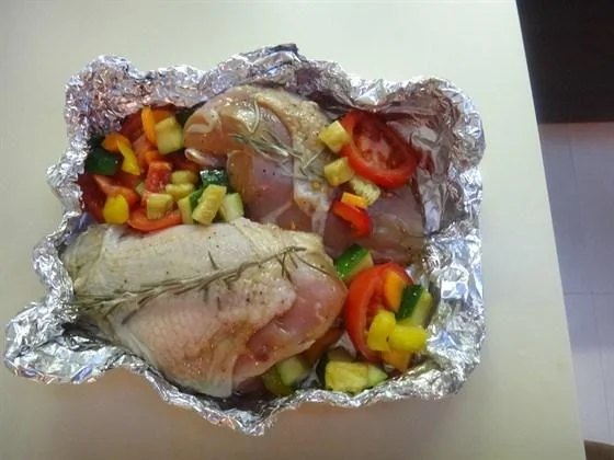 ШАГ 2 Когда грудка закончит мариноваться, посолить ее, поперчить, уложить на противень (я его делала из фольги), немного полить оливковым маслом. Сверху каждой грудки положить по веточке розмарина.
