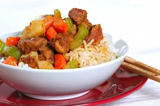 ШАГ 3 Разогрейте масло в большой сковороде, можно в воке, отправьте жариться морковь, перец и бобовые проростки, и жарьте, помешивая, 10 минут. Добавьте свинину и жарьте еще 5 минут. Потом добавьте рис. Налейте соевый соус и посолите, если понадобится. Хорошо перемешайте и подавайте сразу.