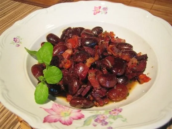 ШАГ 2 Нарезать копченую колбасу небольшими кубиками и добавить к фасоли. Томить в течение еще часа на слабом огне. Добавлять воду, если она будет быстро выпариваться, или держать закрытой крышку сотейника.