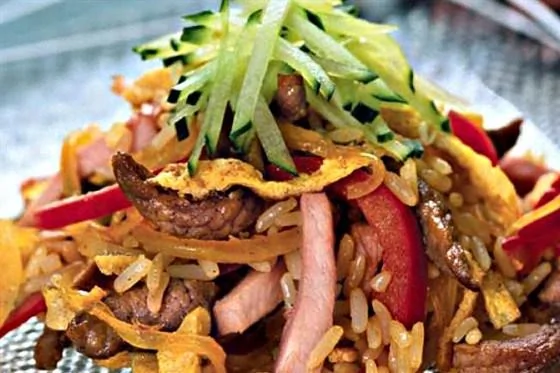 ШАГ 6 Огурец вымыть, нарезать соломкой. Так же нарезать ветчину. Выложить в рис обжаренные лук, перец и говядину. Добавить ветчину и полоски омлета, перемешать. Влить оставшийся соевый соус, приправить острым перцем. При необходимости добавить соль. Перед подачей посыпать нарезанным огурцом.