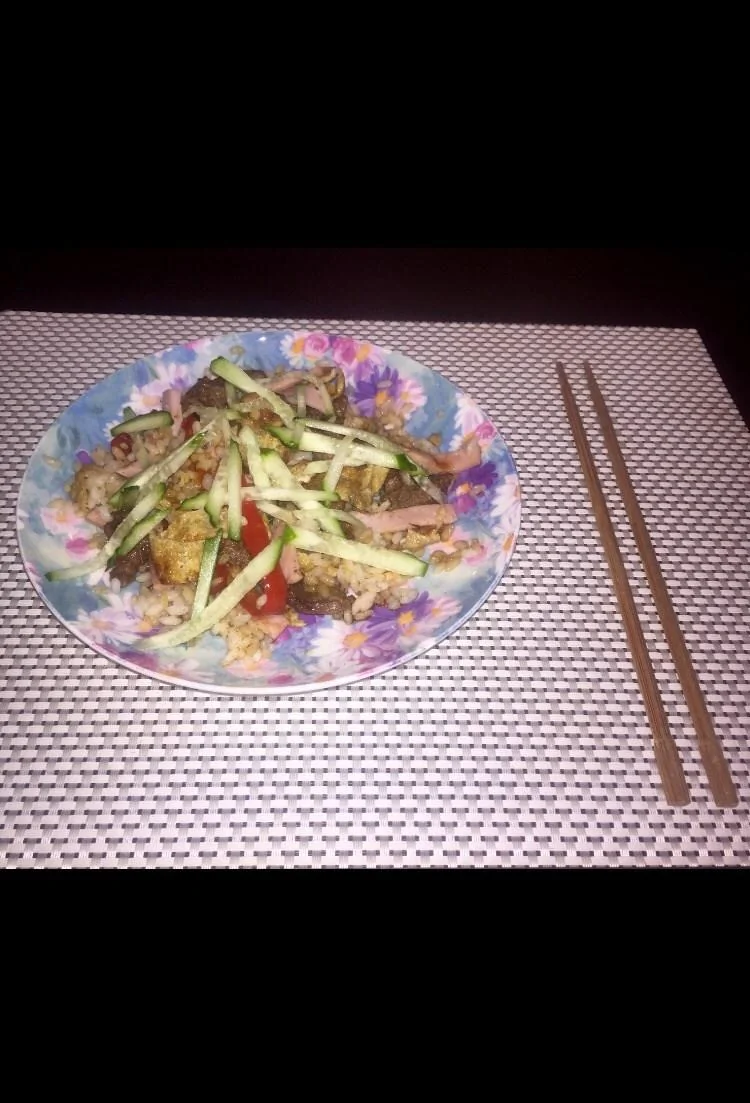Круглый рис Говядина Сладкий перец Вареная ветчина Яйцо куриное Соевый соус Молотый красный перец Лук репчатый Огурцы Основные блюда Японская кухня Плов