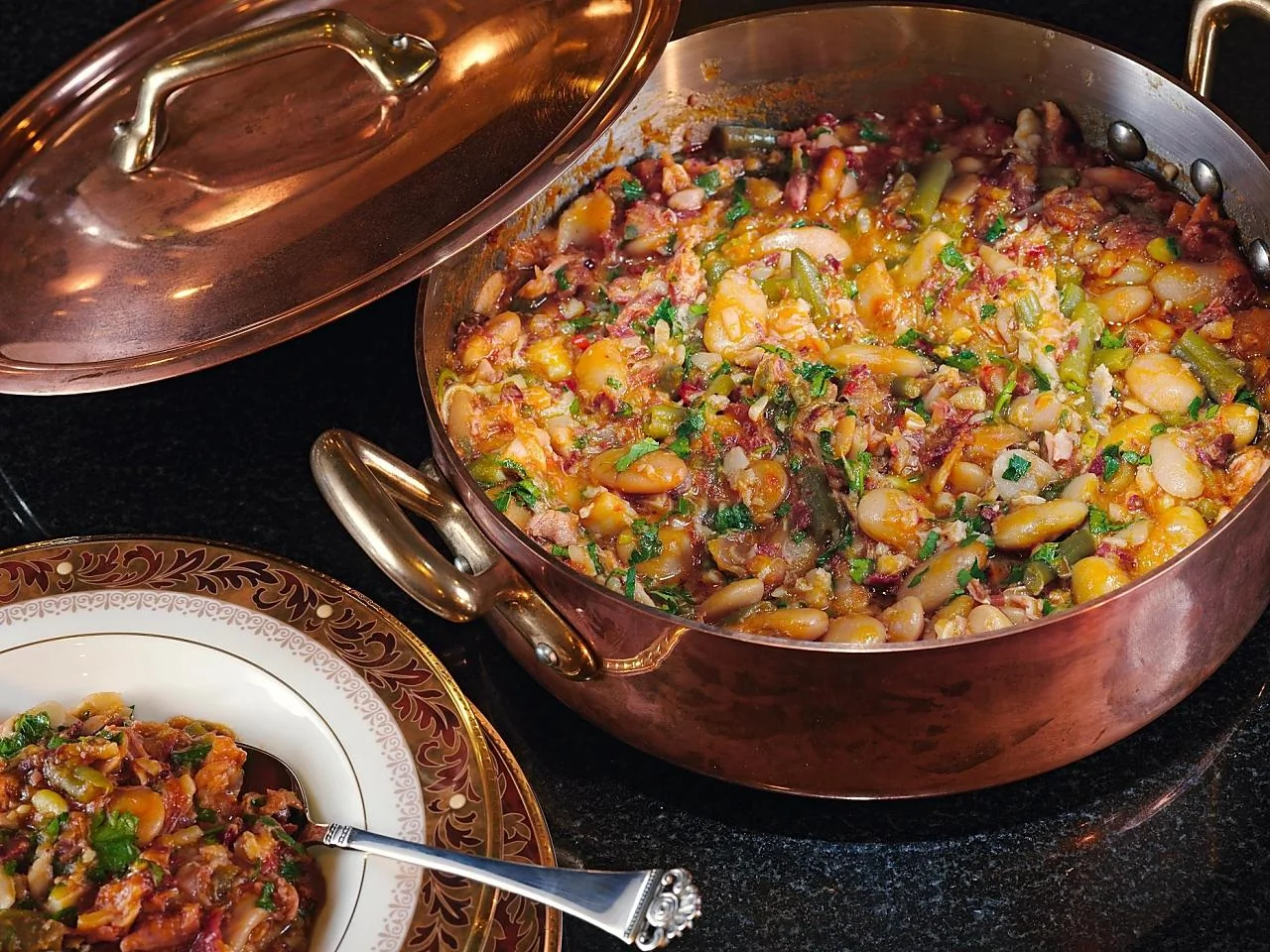ШАГ 4 Отправить заправку к фасоли. Еще минут двадцать потушить косидо на слабом огне, добавив, если нужно, воды и соли. Перед подачей посыпать нарезанными листьями петрушки.