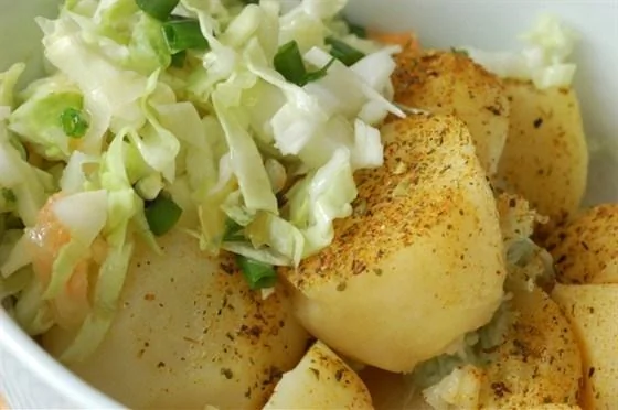 ШАГ 1 Картофель и морковь помыть, отварить, дать остыть и очистить. Нарезать ломтиками, добавить квашеную капусту и мелко нарезанный лук (репчатый или зеленый). Салат заправить майонезом или сметаной.