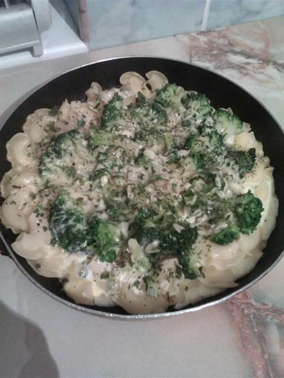 ШАГ 3 На разогретую сковороду вылить оливковое масло, выложить слоем макароны, затем брокколи.