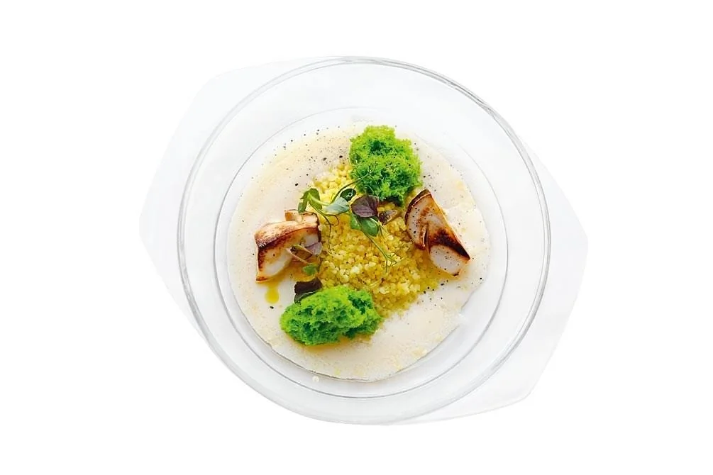 ШАГ 4 Перед подачей отсадить тесто из сифона в пластиковые стаканчики и в них испечь бисквиты в печке СВЧ (1 минуту в режиме 900 Вт). В тарелку выложить пшенку, жареные грибы, два зеленых бисквита, полить сырным соусом и сразу подавать.