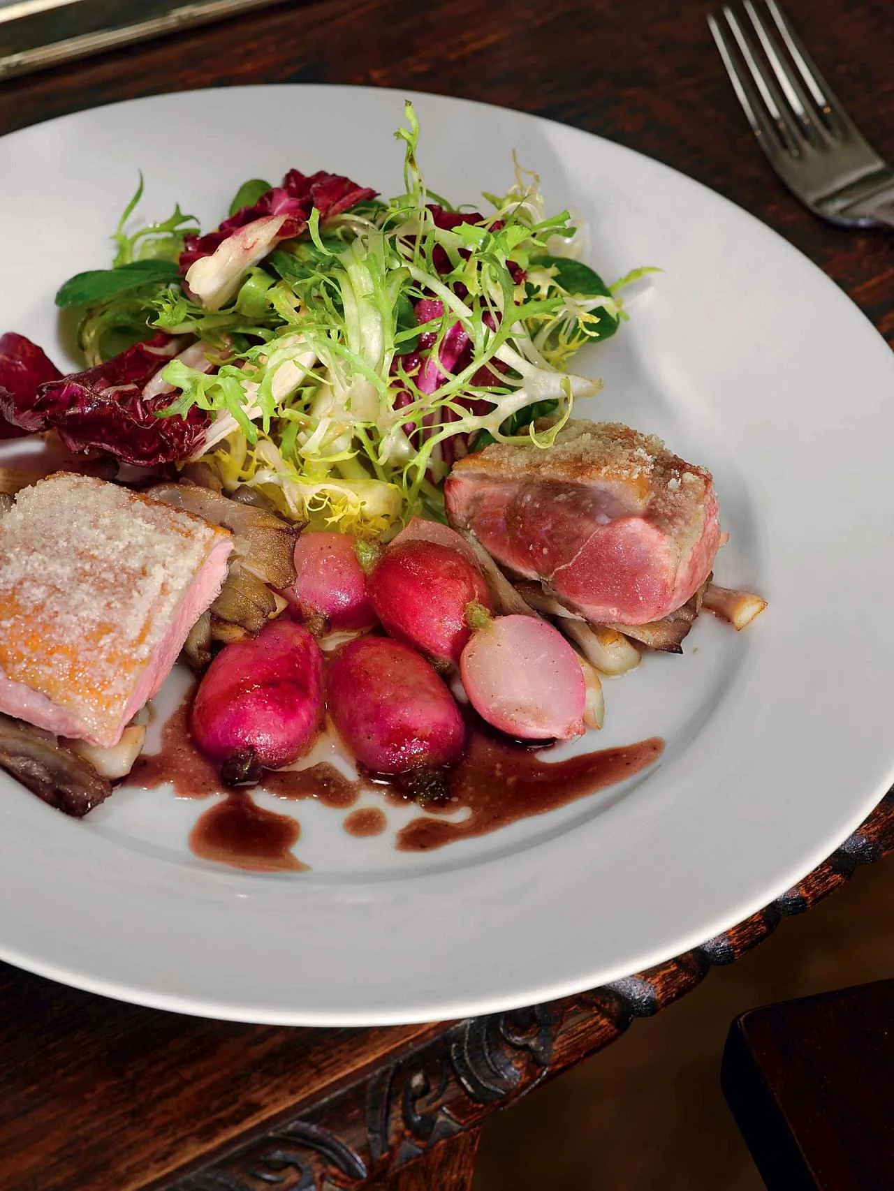 Утиное филе в миндале с жареными вешенками и томленой редиской