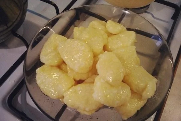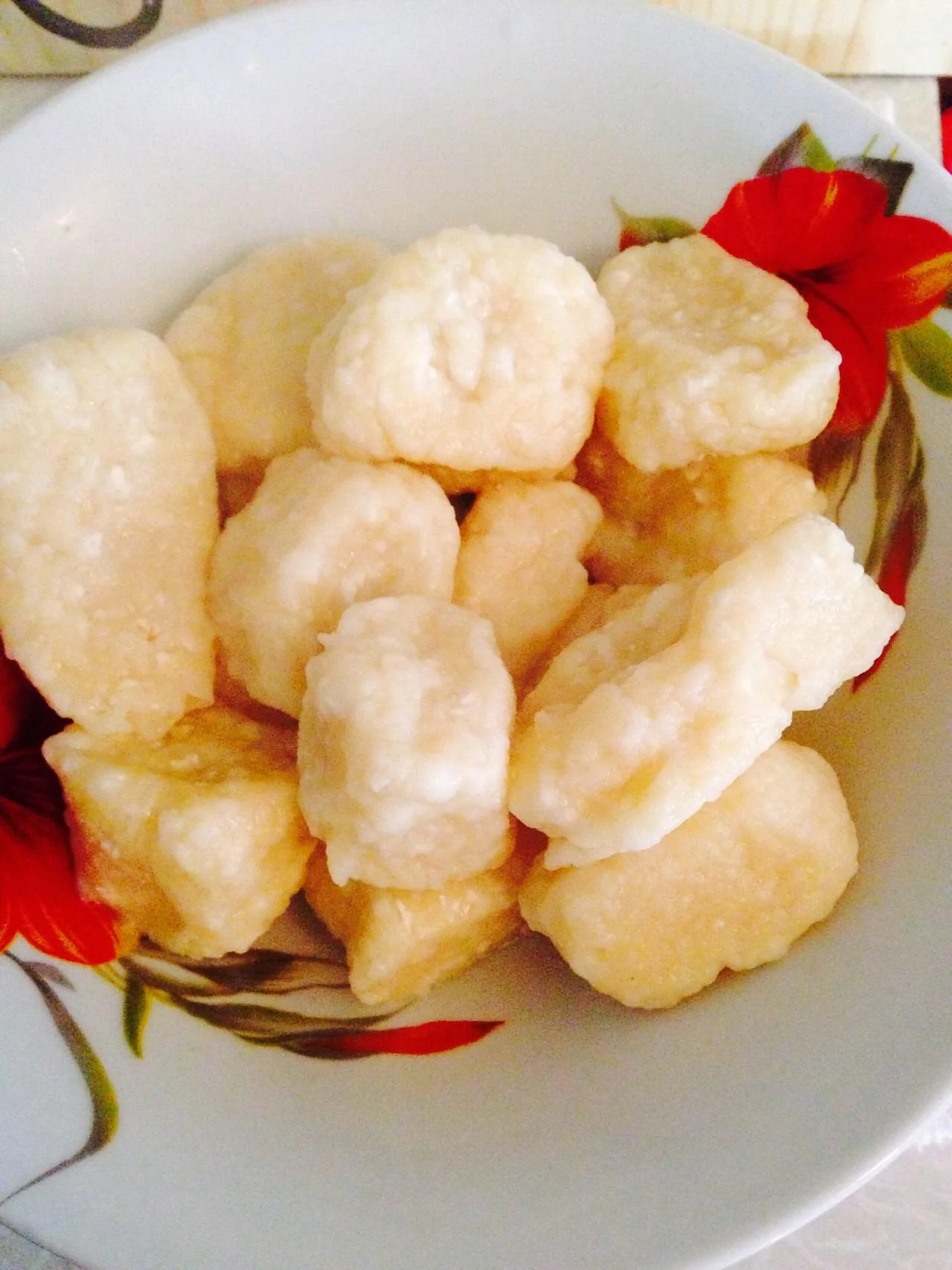 ШАГ 4 Сделать из теста колбаски, нарезать на кусочки и немного прижать с двух сторон, обмакивая в муку.