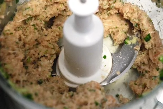ШАГ 2 Куриное филе измельчить в комбайне, добавить яичный белок, молоко, лук, чеснок и зелень.
