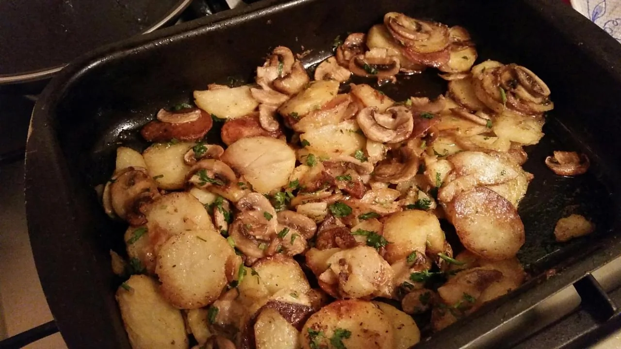 ШАГ 8 Мелко нарезаем петрушку. Снимаем сковороду с картошкой с огня и проверяем специи на вкус. В этот момент можно добавить соли или перца, если их количество кажется недостаточным. Вмешиваем в блюдо грибы и петрушку. Отправляем в духовку на 10-15 минут, чтобы корочка подрумянилась.