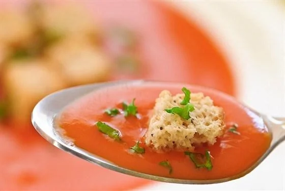Суп из запеченных в духовке помидоров с базиликом и оливковыми гренками