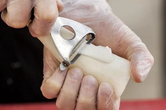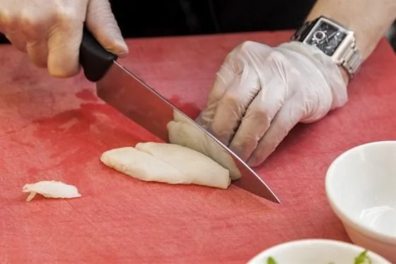 ШАГ 4 Филе сома без кожи и костейнарезаем наискосок очень острым ножом, так как рыба имеет очень нежную и неплотную структуру.