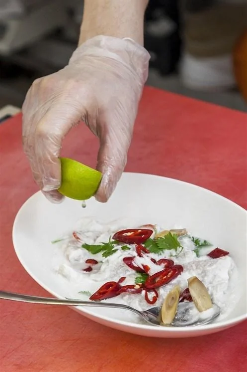 ШАГ 10 Декорируем чили перцем, долькой лайма (можно выжать из него сок в готовое блюдо), посыпаем листьями кинзы и кунжутом.