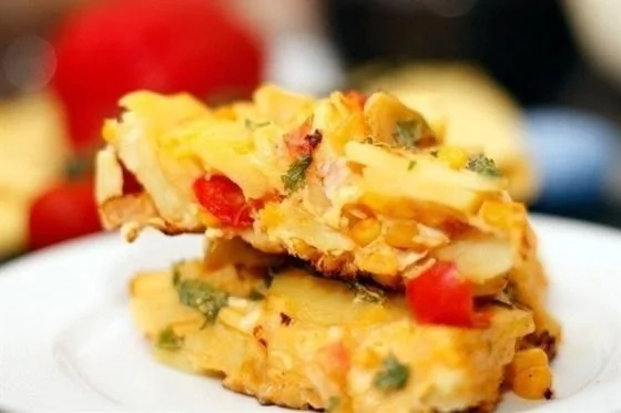ШАГ 1 Очистите и нарежьте кружочками картофель. Разноцветный перец очистите от семян, нарежьте кубиками.