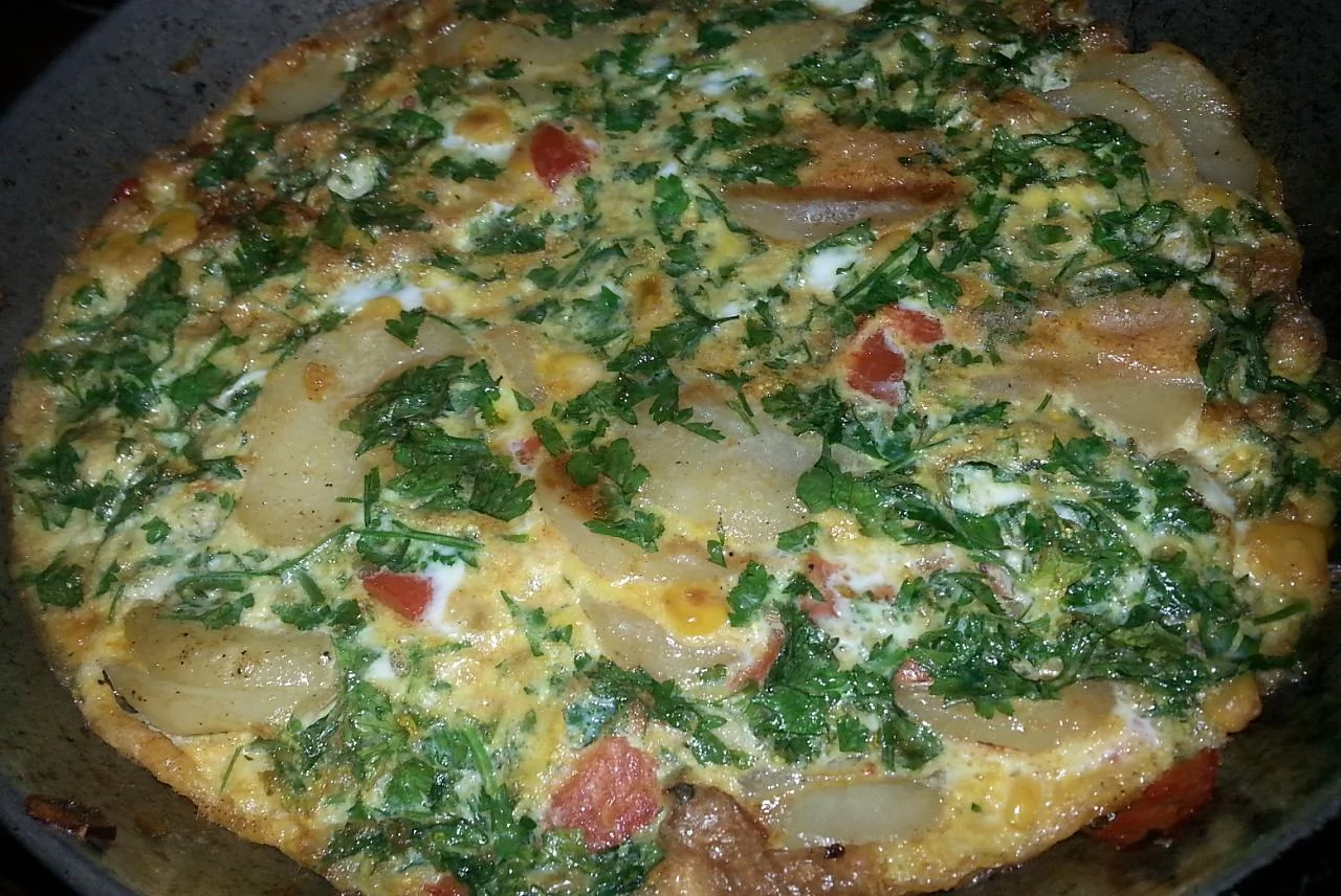 ШАГ 5 В миске слегка взбейте вилкой яйца снарезанной зеленью и солью, влейте яйца в сковороду.