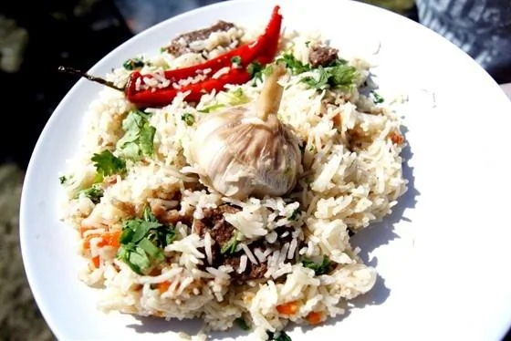 ШАГ 8 Снять плов с огня, вынуть перец, чеснок, аккуратно перемешать, посыпать нарезанной кинзой и выложить на большое блюдо.