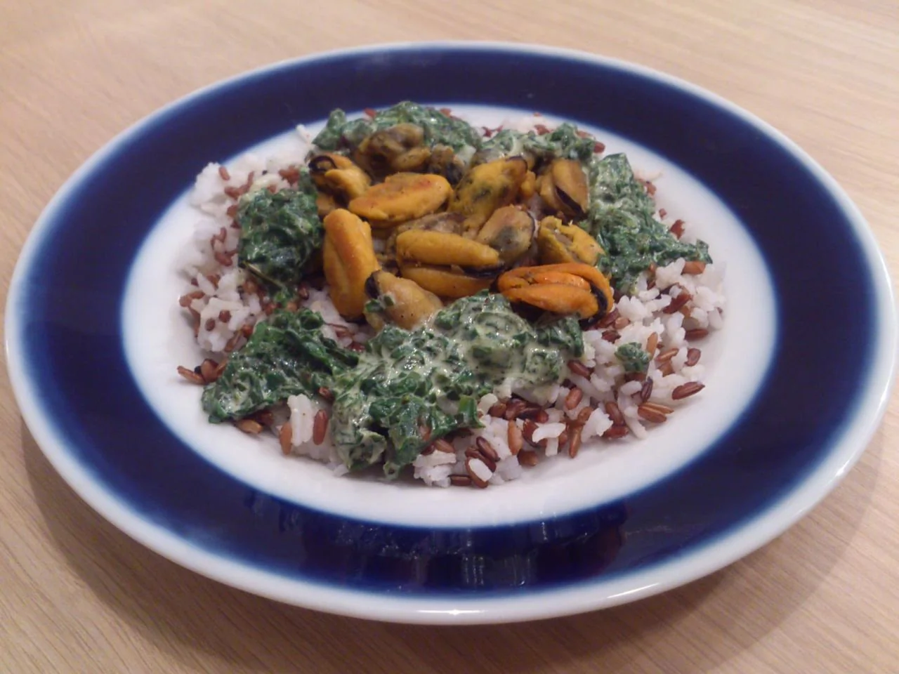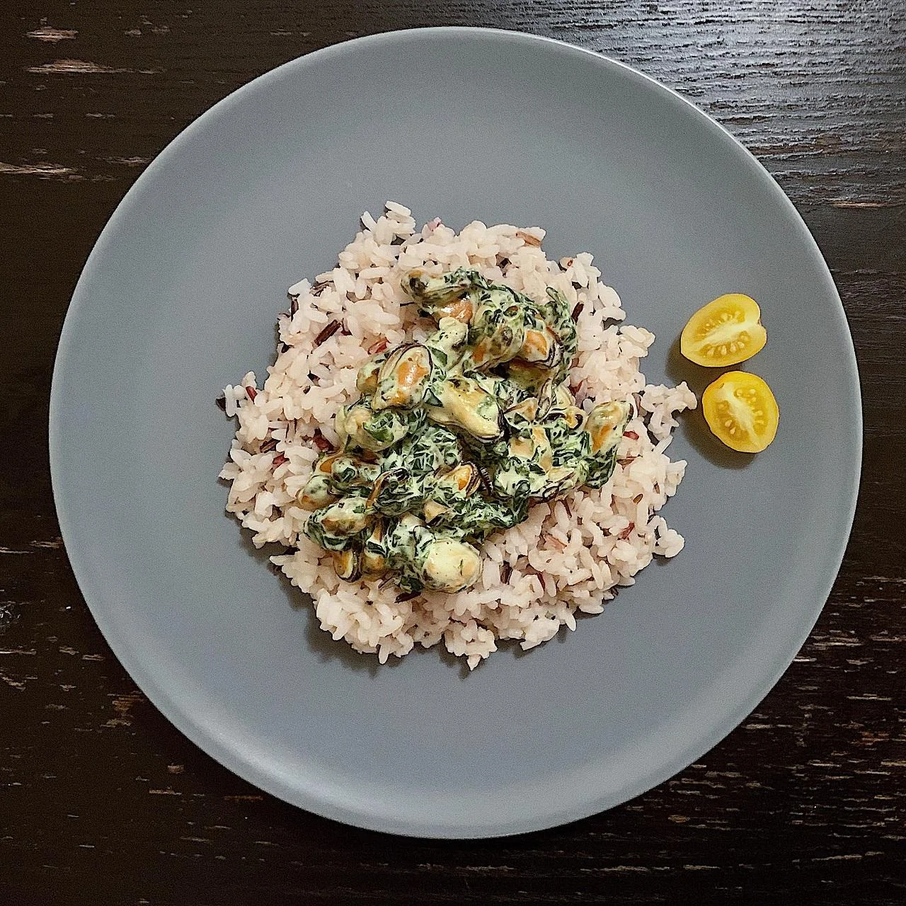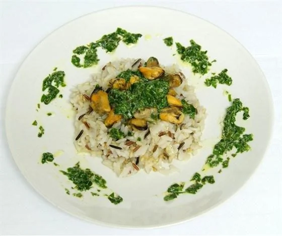 Четыре риса с мидиями и соусом из шпината