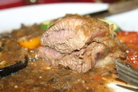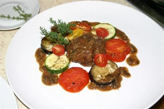 Щечки теленка, томленые в демиглясе, с запеченными овощами и грибным соусом