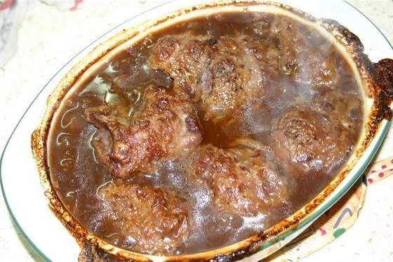 ШАГ 2 Бережно укладываем щечки в жаропрочную посудину, заливаем демиглясом, отправляем в духовой шкаф при 180 градусах, на 2 часа.