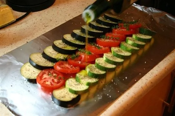 ШАГ 3 Режем баклажан, цукини, томаты кольцами. Солим, добавляем пряности, оливковое масло. Заворачиваем в фольгу. Ставим в духовой шкаф на 20 минут, при 200 градусах.