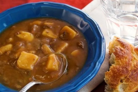 ШАГ 3 Отдельно смешать муку, томатную пасту, толченый чеснок и масло с небольшим количеством отвара от тушения. Полученную смесь влить в посуду с овощами и мясом и тушить еще на максимальной мощности СВЧ-печи 2–3 минуты.