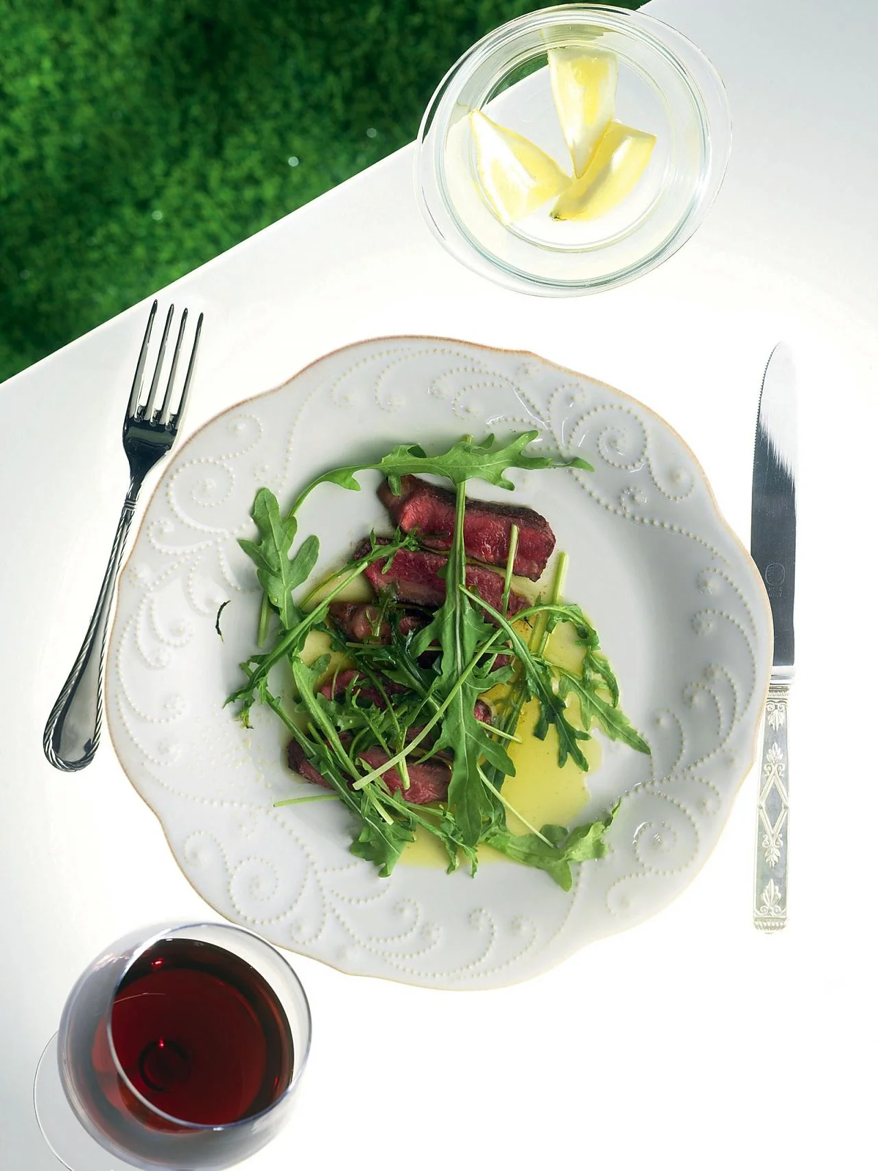 Лимон Чеснок Оливковое масло Розмарин Рукола Сыр пармезан Сирлойн-стейк Перец черный молотый Соль Растительное масло Основные блюда Итальянская кухня
