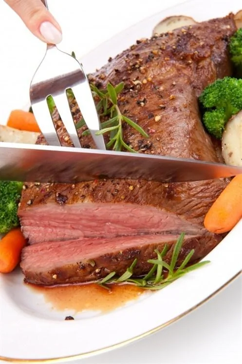 ШАГ 3 Когда ростбиф готов, его снимают со сковороды, нарезают ломтиками и укладывают на блюдо. На гарнир можно дать нарезанную дольками морковь и зеленый горошек, заправленные маслом, картофель (отварной, жареный, в молоке или в виде пюре) и строганый хрен. Мясо поливают процеженным соком, образовавшимся при жарении, и растопленным маслом.