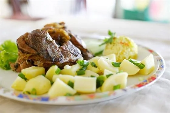 ШАГ 2 Готовую баранину нарезать ломтиками, уложить на блюдо, прибавить гарнир - картофель отварной с маслом или жареный, а также фасоль в томате или масле, посыпать зеленью петрушки или укропом и полить процеженным соком.