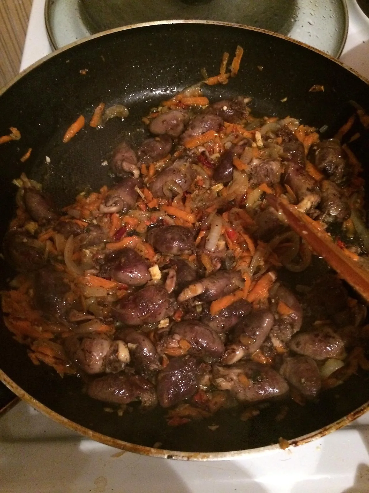 ШАГ 1 Разморозьте полностью куриные сердечки. Тщательно промойте под проточной водой. Удалите тонкую прозрачную пленку. Разогрейте на сковороде растительное масло и выложите сердечки. Обжаривайте 5–7 минут. Когда на сердечках образуется корочка, налейте полстакана воды и тушите 15–20 минут, регулярно помешивая. Следите за тем, чтобы сердечки не пригорели. Вовремя подливайте воду, если она быстро испаряется.