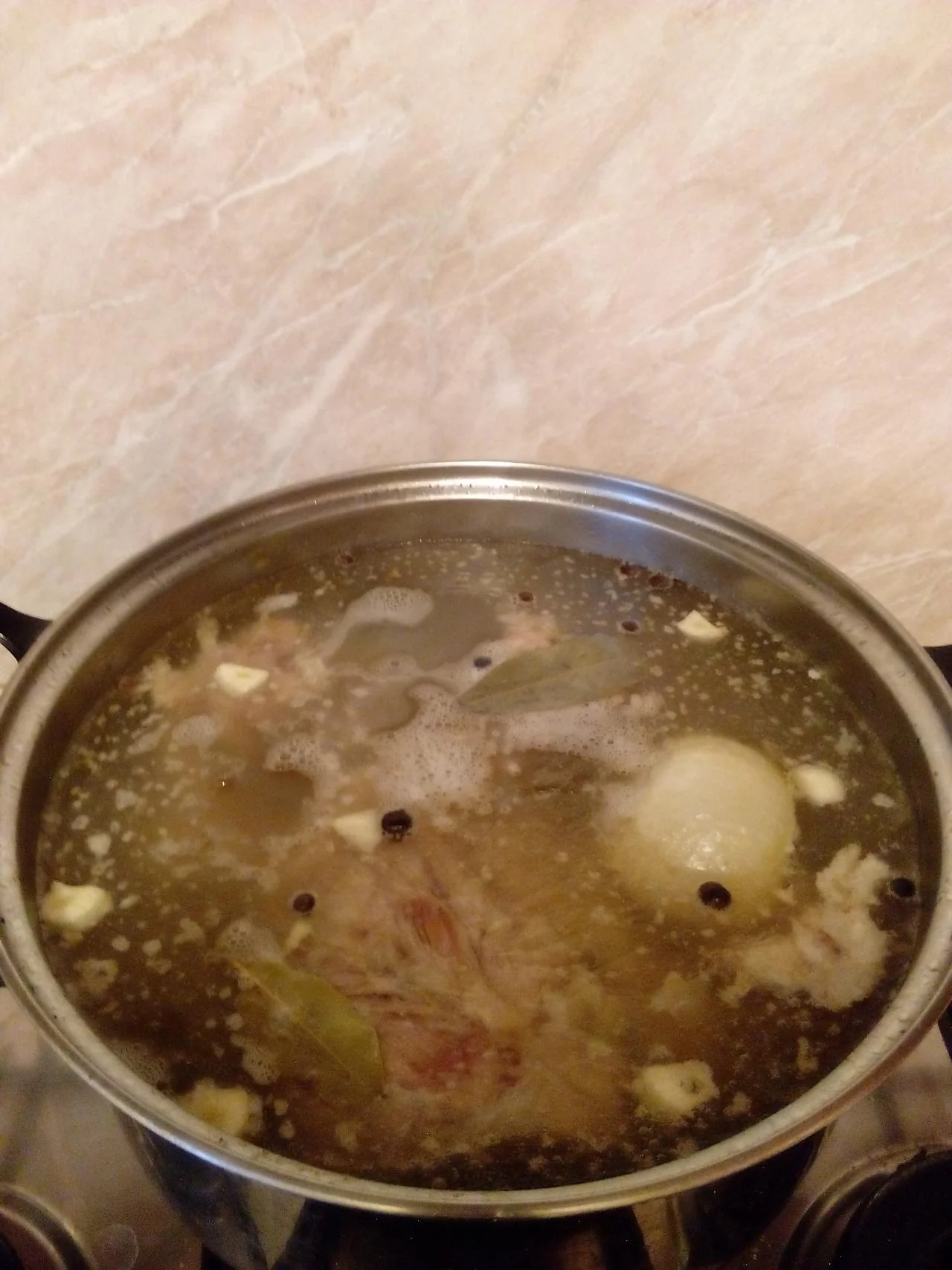 ШАГ 2 Когда содержимое бачка закипит, снимаем пену, уменьшаем огонь до минимума, чтобы только немного булькало и продолжаем варить под крышкой 8 часов. За час до готовности солим, кладем лаврушку, перец и лук. Выключаем огонь, оставляем остывать.