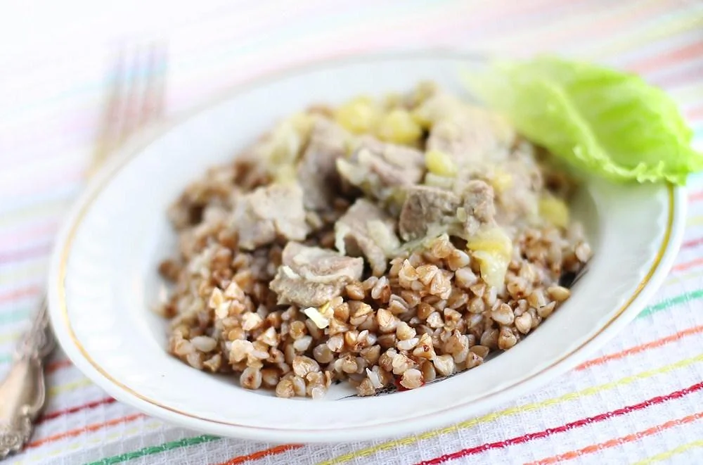 ШАГ 5 Пока мясо тушится, сварите гречку (из расчета 1 стакан гречки на 2 стакана воды — это на 2–3 порции). В кипящую воду добавьте промытую гречку, варите на среднем огне 15 минут, добавьте кусок сливочного масла, выключите огонь и томите гречку под крышкой еще 15 минут.