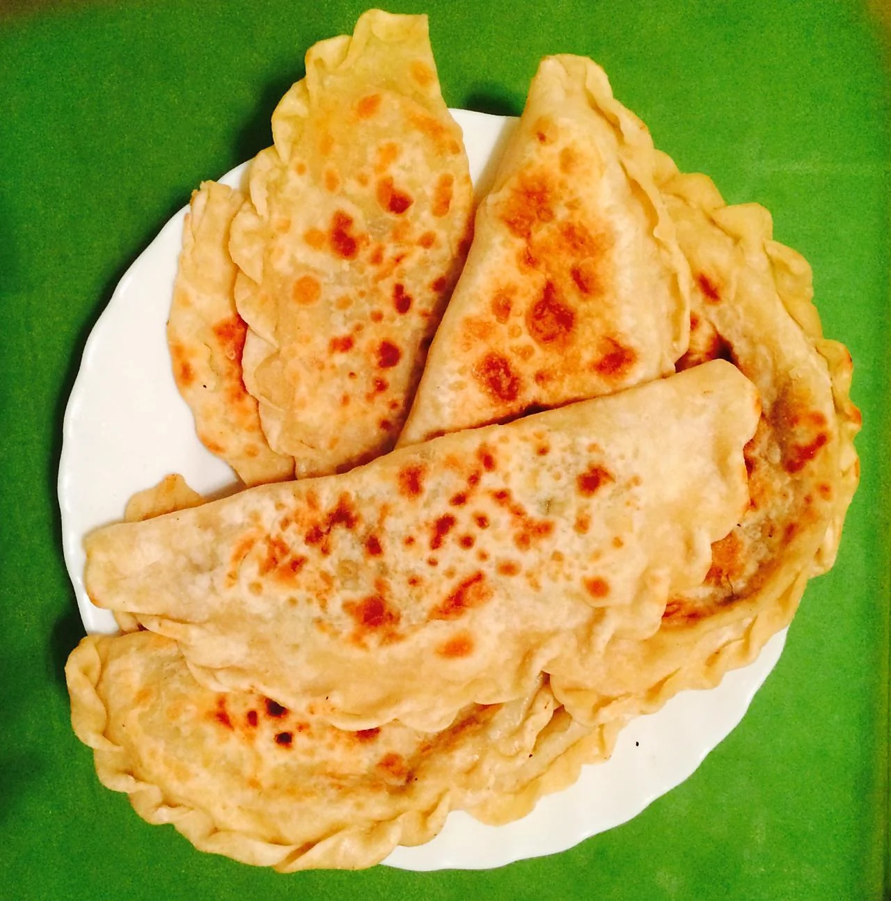 ШАГ 2 Все ингредиенты для теста перемешать, тесту дать отдохнуть, накрыть салфеткой на 20 минут! Из теста сделать шарики, раскатать, в серединку положить начинку, края защипнуть.