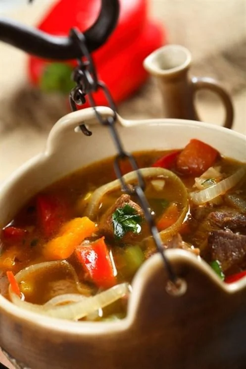ШАГ 1 Баранью лопатку нарезать крупными кусками, посолить, посыпать красным перцем и сложить в глиняную или огнеупорную кастрюлю. Залить разогретым жиром, добавить лук и тушить, помешивая время от времени.