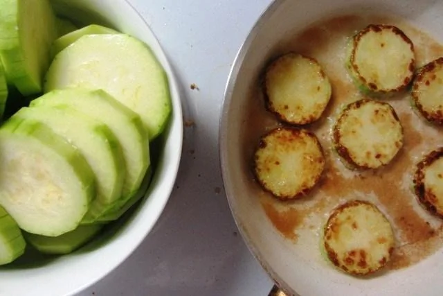 ШАГ 2 Кольца кабачков солим, обваливаем в муке и обжариваем по 3 минуты с каждой стороны до золотистой корочки, затем складывает в кастрюлю.