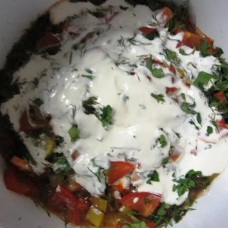 ШАГ 4 Через 10–12 минут снимаем крышку, тушим еще 5 минут, добавляем сметану, соль, перец и тушим еще 5–6 минут. Посыпаем зеленью.