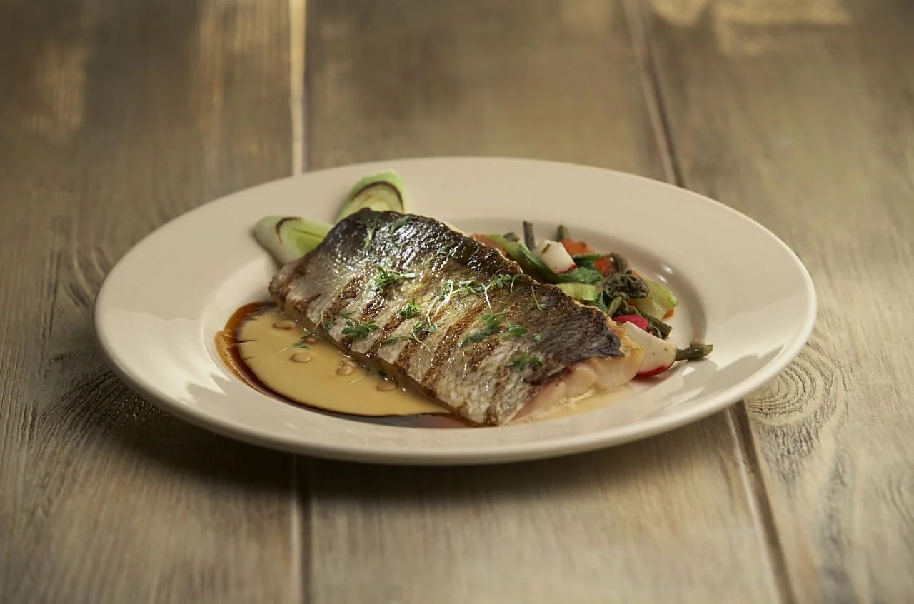Жареное филе муксуна с теплым овощным салатом и орляком