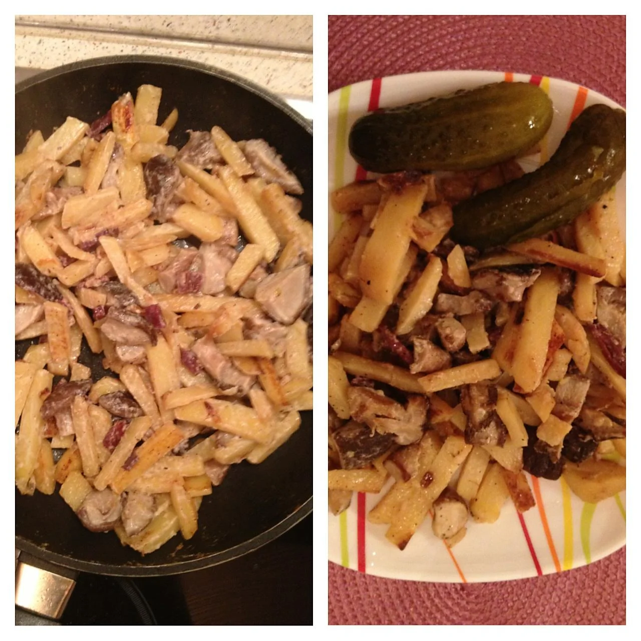 ШАГ 4 Отваренные грибы положите в сковороду к картошке.