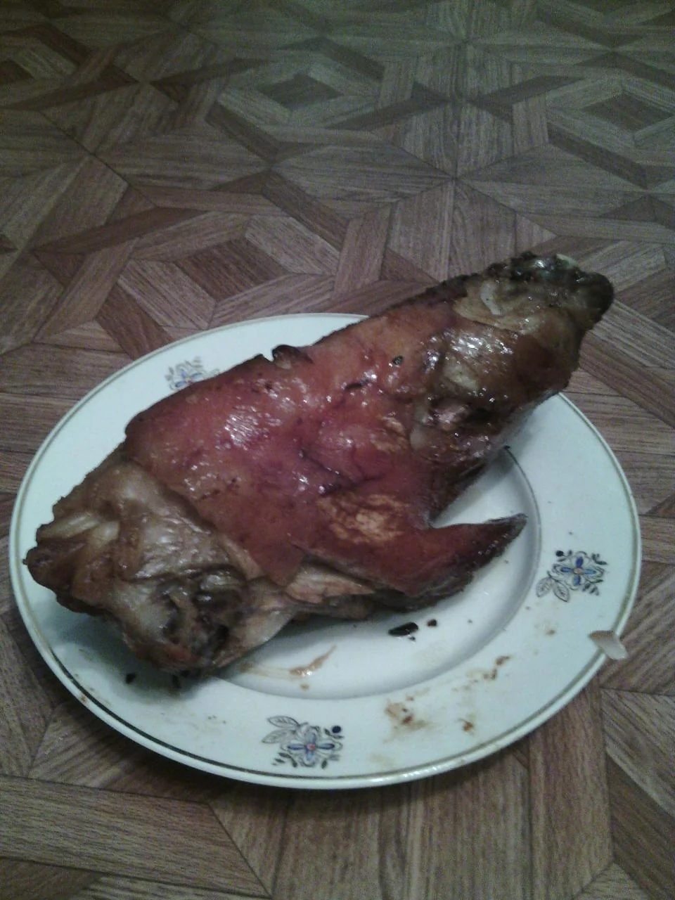 ШАГ 3 Отваренную рульку приправить по вкусу перцем, солью, имбирем и нашпиговать чесноком, поставить в предварительно разогретую духовку на 40–45 минут при температуре 180–190 градусов.