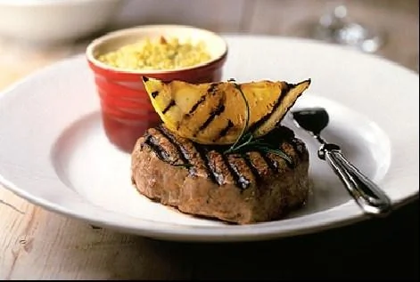 ШАГ 1 Выровнять бифштексы ладонями. Измельчить розмарин и смешать его с оливковым маслом. Натереть бифштексы маслом с розмарином и оставить на некоторое время, пока разогревается сковорода. Поджарить бифштексы в течение 3 минут с каждой стороны. Присыпать крупной солью и свежемолотым черным перцем. Поместить бифштексы в духовку на 4 минуты, чтобы они слегка пропеклись. Подавать с дольками лимона и печеной чечевицей.