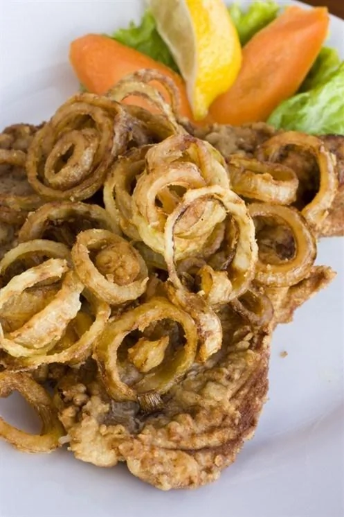 ШАГ 3 Отдельно поджарить в течение 2 минут в масле нарезанный кольцами лук. Лук выложить на бифштексы.