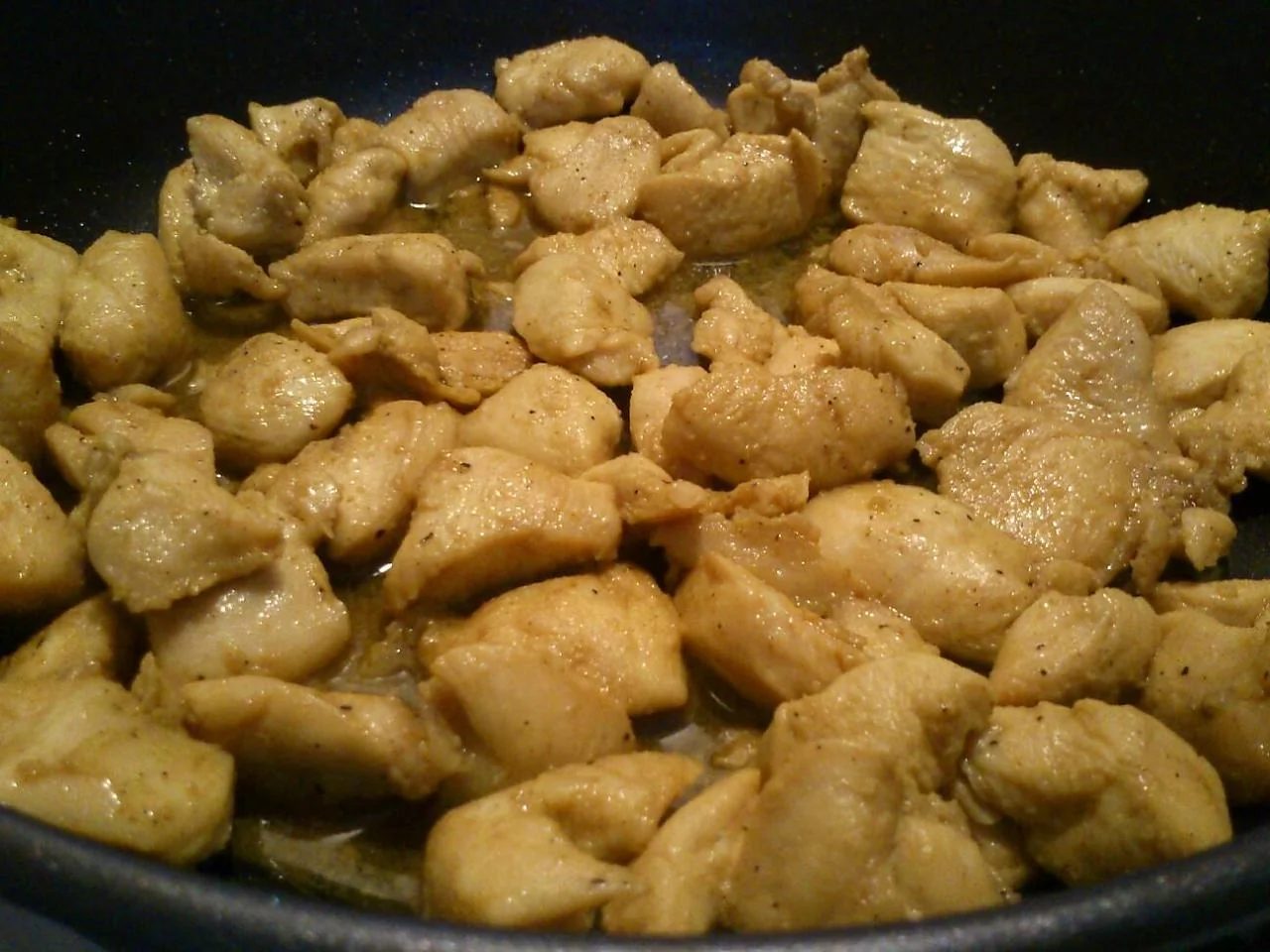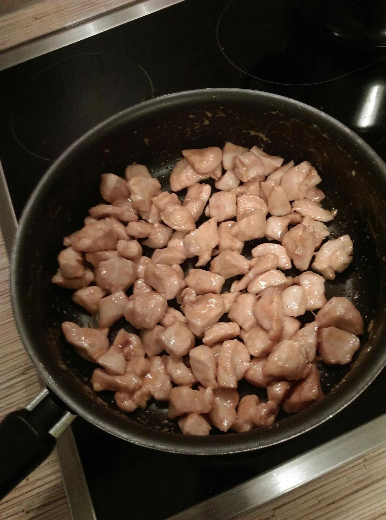 ШАГ 1 Куриные грудки промыть и нарезать кубиками. Сложить в глубокую чашку. Отставить.