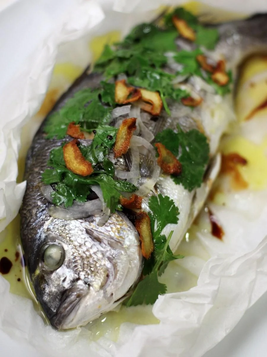 ШАГ 4 На готовой дораде разложить лук полукольцами и листья кинзы. Полить раскаленным имбирным маслом — оно своей температурой размягчит овощи. Побрызгать соевым соусом.