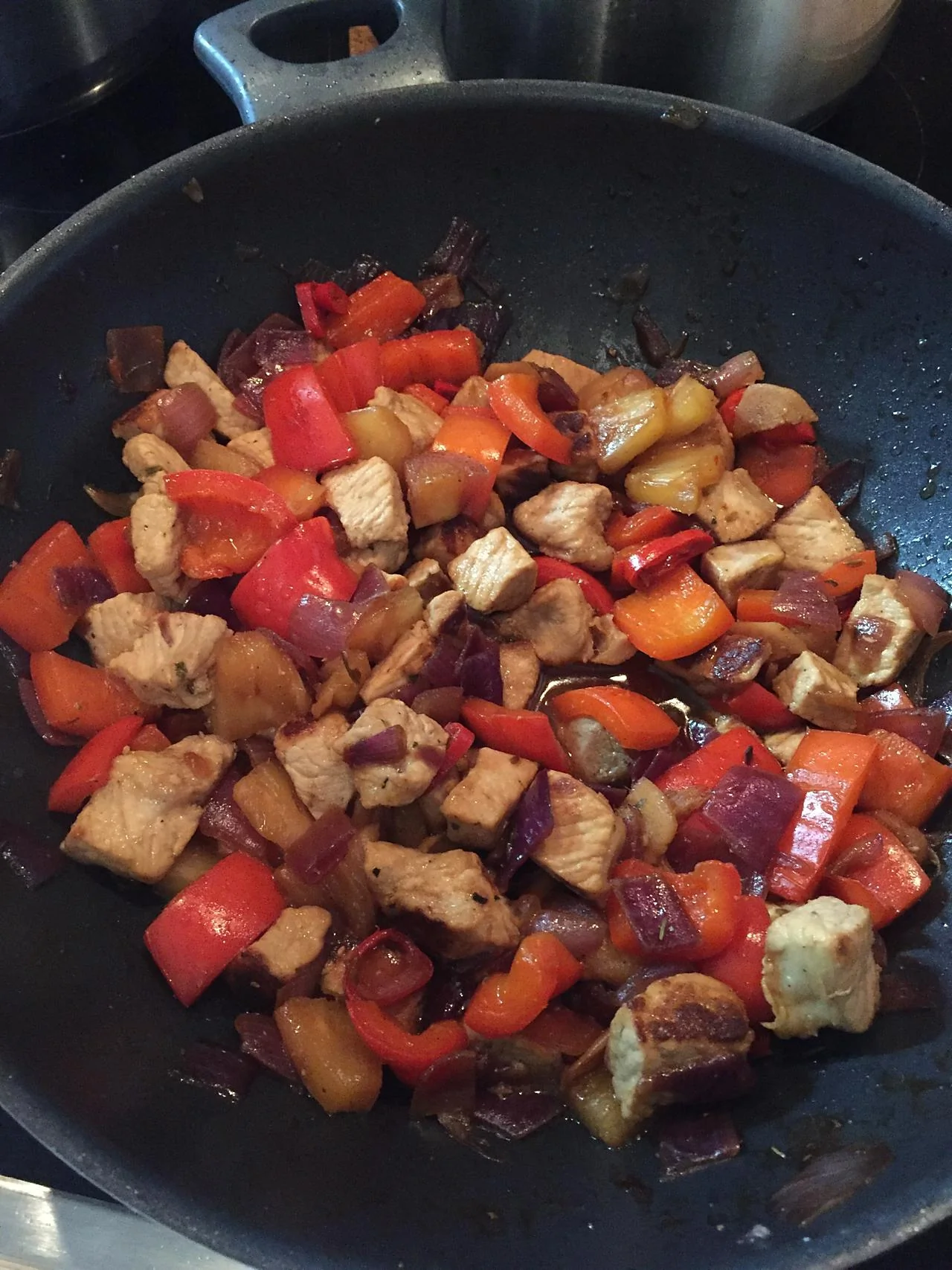ШАГ 2 Сильно раскалите вок ( или большую сковороду ), плесните немного оливкового масла, выложите свинину, добавьте смесь 5 специй и перемешайте. Жарьте несколько минут, пока мясо не по кроется корочкой, затем шумовкой переложите мясо в миску. Быстро вытрите вок комком бумажного полотенца, поставьте его обратно на огонь. Когда он снова раскалится, влейте в него оливкового масла и добавьте все нарезанные ингредиенты (кроме мяса). Жарьте, непрерывно перемешивая, 3 минуты. Всыпьте крахмал и добавьте 2 столовые ложки соевого соуса. Через 30–40 секунд добавьте кусочки ананаса вместе с соком, свинину и 2 столовые ложки бальзамического уксуса. Приправьте черным перцем. Разломите кусочек свинины, проверьте, прожарилась ли она, и снимите вок с огня.