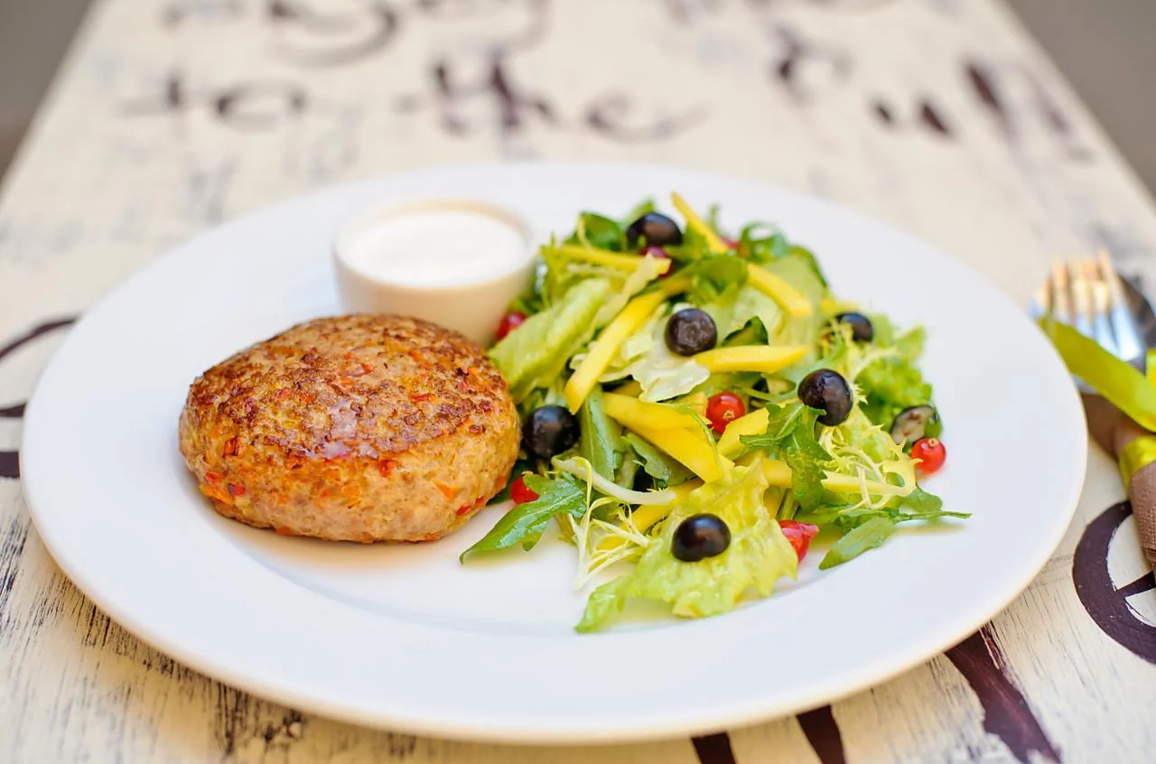 Бургер из индейки с зеленым салатом и фермерской сметаной