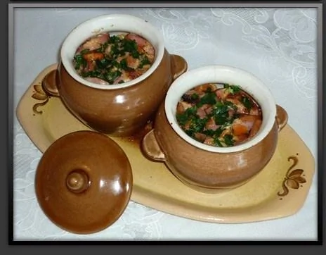 ШАГ 4 Уложить в горшочки слоями. Посолить, поперчить. В каждый горшочек положить по лавровому листику. Залить холодным бульоном. Горшочки накрыть крышками.
