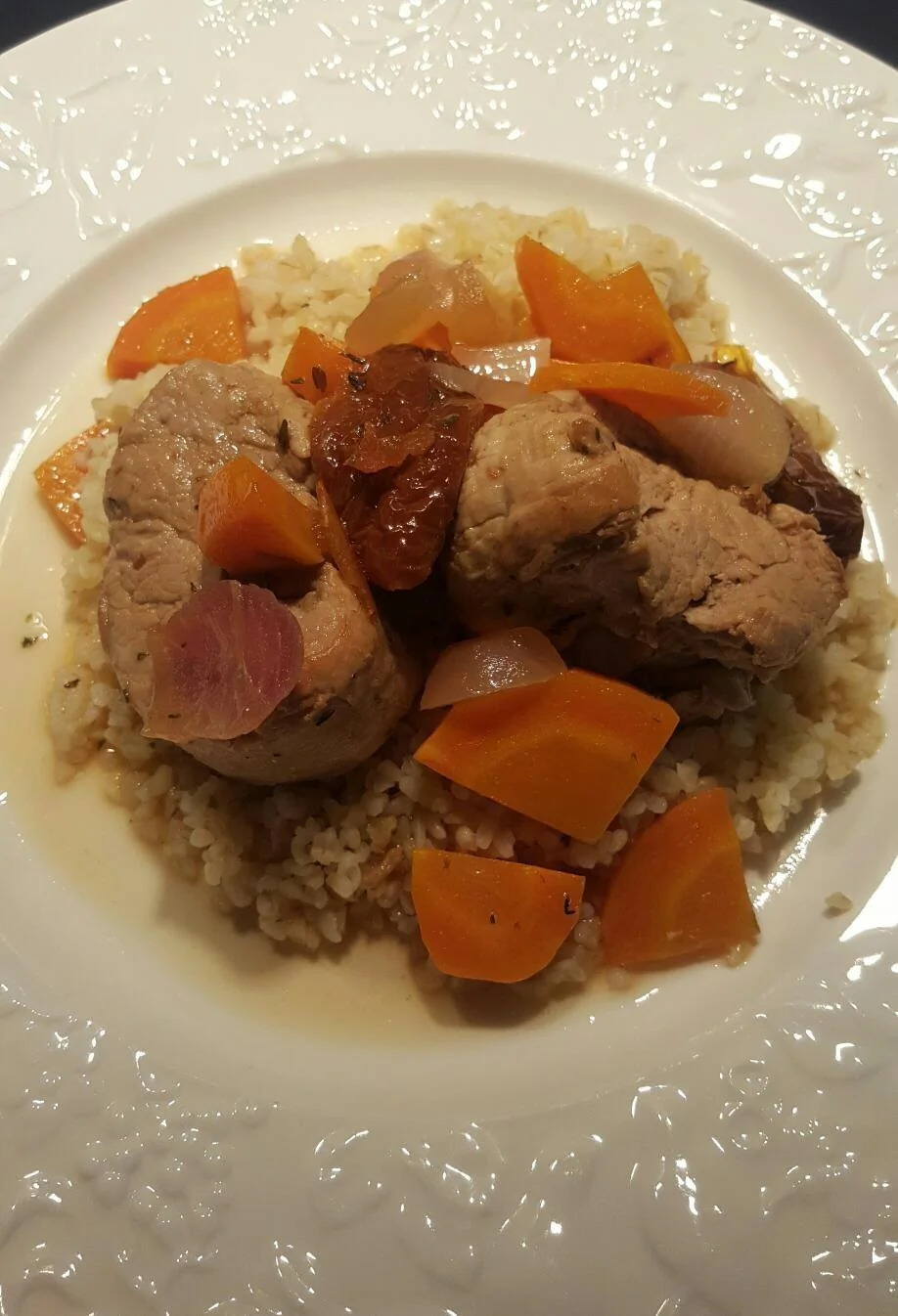 ШАГ 1 В сотейнике обжарить на оливковом масле крупно нарезанные морковь и лук и нарезанную большими (примерно по два на порцию) кусками телятину.