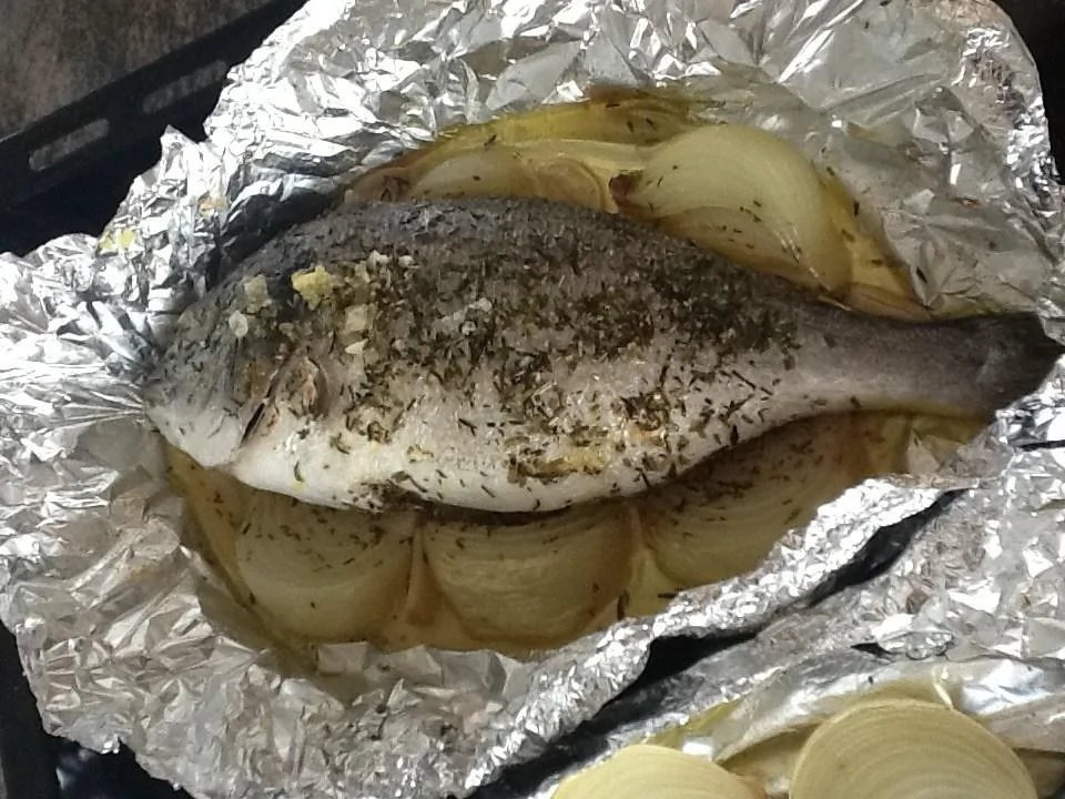 ШАГ 3 Лук порезать крупными дольками, оставшийся чеснок и травы (еще по 2–3 веточки) разложить вокруг рыбы, посолить, поперчить, полить оливковым маслом, закрыть фольгой и запекать в духовке при температуре 200 градусов 20–25 минут.