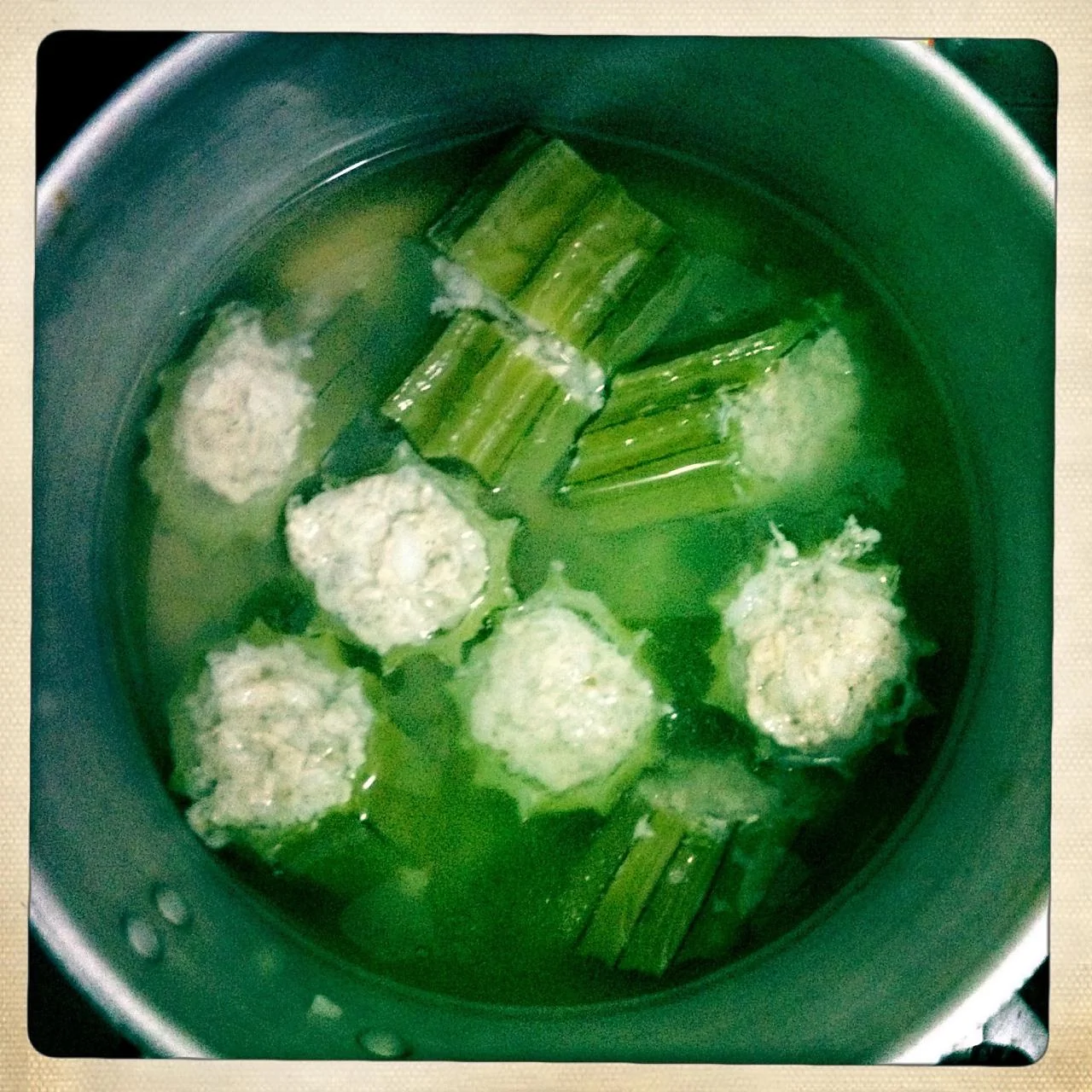 ШАГ 6 Нафаршировать люфу. Аккуратно выложить в пустую кастрюльку, залить бульоном. Довести до кипения.