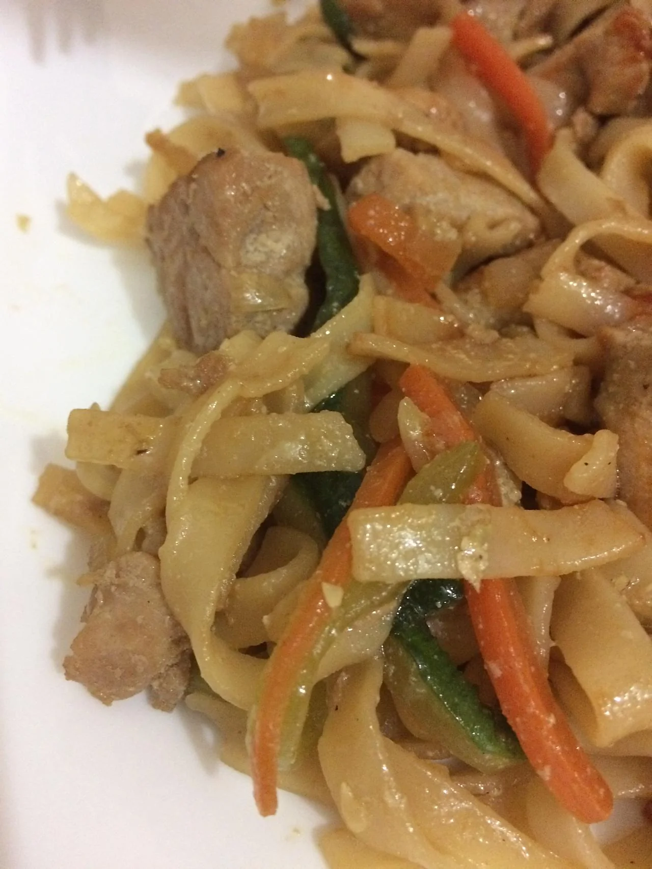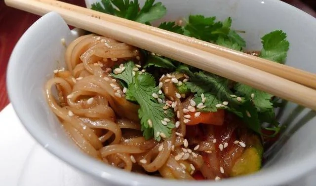 ШАГ 6 Добавить рисовую лапшу к курице и овощам, хорошо перемешать.