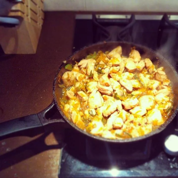 ШАГ 5 К овощам добавить курицу вместе с оставшимся маринадом. Тушить курицу до готовности, при необходимости добавляя соус или соус-маринад. Блюдо дополнительно солить не нужно, так как соус достаточно соленый.