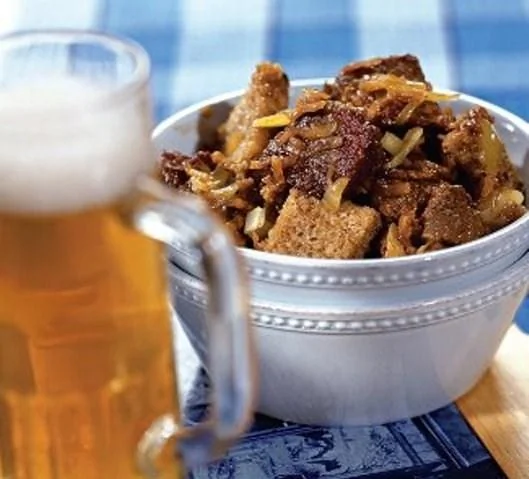 ШАГ 5 С хлеба срезать корки, обмазать его горчицей и добавить к мясу вместе с луком. Посыпать сахаром, посолить, поперчить и тушить еще 10 минут.